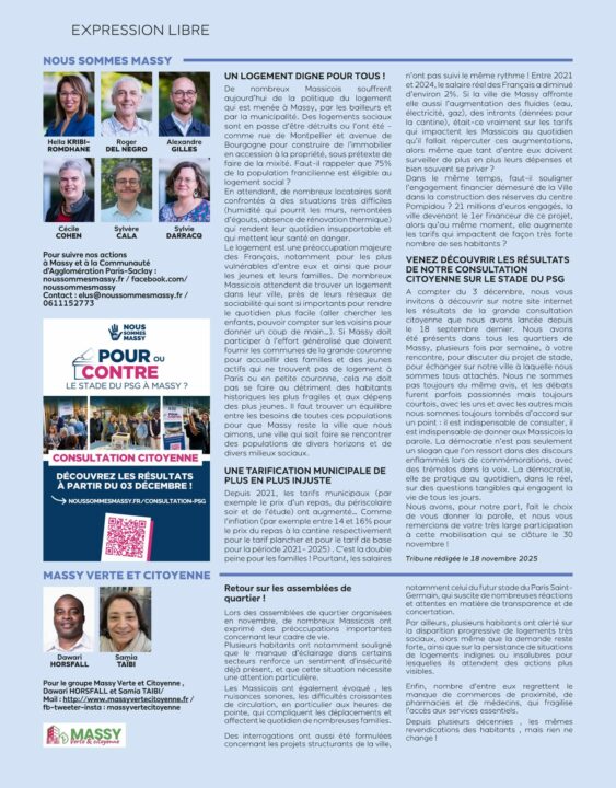 Le logement est une préoccupation majeure des Français, notamment pour les plus vulnérables d’entre eux et ainsi que pour les jeunes et leurs familles. De nombreux Massicois attendent de trouver un logement dans leur ville, près de leurs réseaux de sociabilité qui sont si importants pour rendre le quotidien plus facile (aller chercher les enfants, pouvoir compter sur les voisins pour donner un coup de main…). Si Massy doit participer à l’effort généralisé que doivent fournir les communes de la grande couronne pour accueillir des familles et des jeunes actifs qui ne trouvent pas de logement à Paris ou en petite couronne, cela ne doit pas se faire au détriment des habitants historiques les plus fragiles et aux dépens des plus jeunes. Il faut trouver un équilibre entre les besoins de toutes ces populations pour que Massy reste la ville que nous aimons, une ville qui sait faire se rencontrer des populations de divers horizons et de divers milieux sociaux.