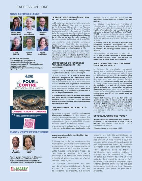 Massy doit respirer, créer du lien entre ses quartiers et veiller à rester une ville à taille humaine : c’est tout le contraire du projet qatari de PSG-LAND honteusement soutenu par un maire qui s’était pourtant engagé à ralentir la bétonisation. N’hésitez pas à nous contacter pour participer à la réflexion sur le projet que nous portons.