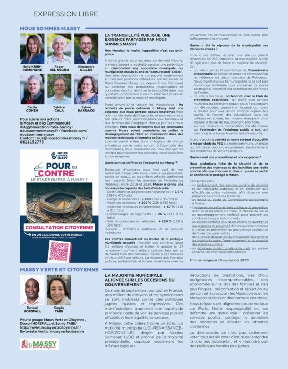 À notre grande surprise, dans sa dernière tribune, le maire sortant a souhaité susciter une polémique en caricaturant une opposition municipale qui multiplierait depuis 30 ans les “postures anti-police”. Une telle description ne correspond évidemment en rien aux positions défendues par les élu·es de Nous Sommes Massy qui, depuis 6 ans, formulent au contraire des propositions responsables et concrètes visant à renforcer la tranquillité dans nos quartiers, propositions il est vrai rarement prises en considération par la majorité municipale.